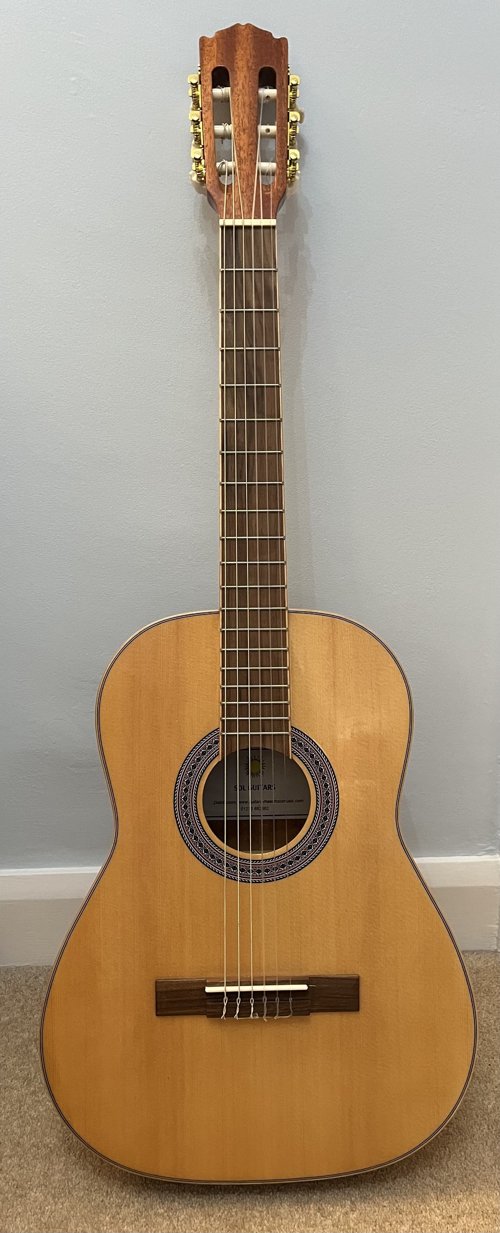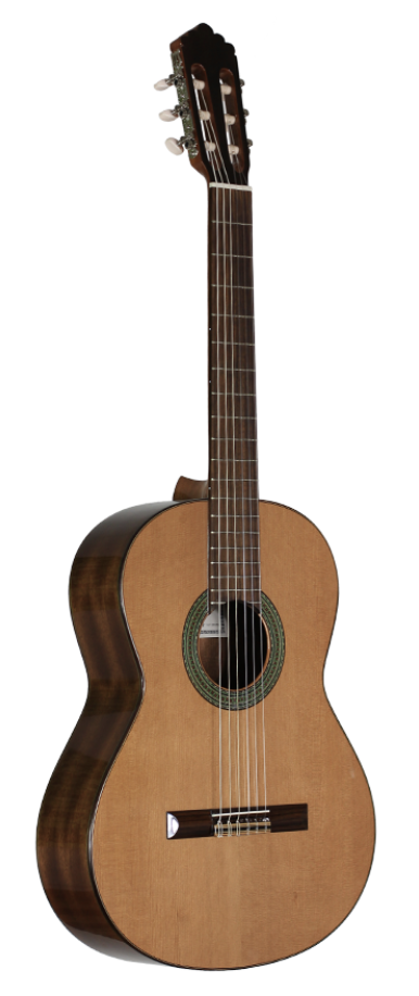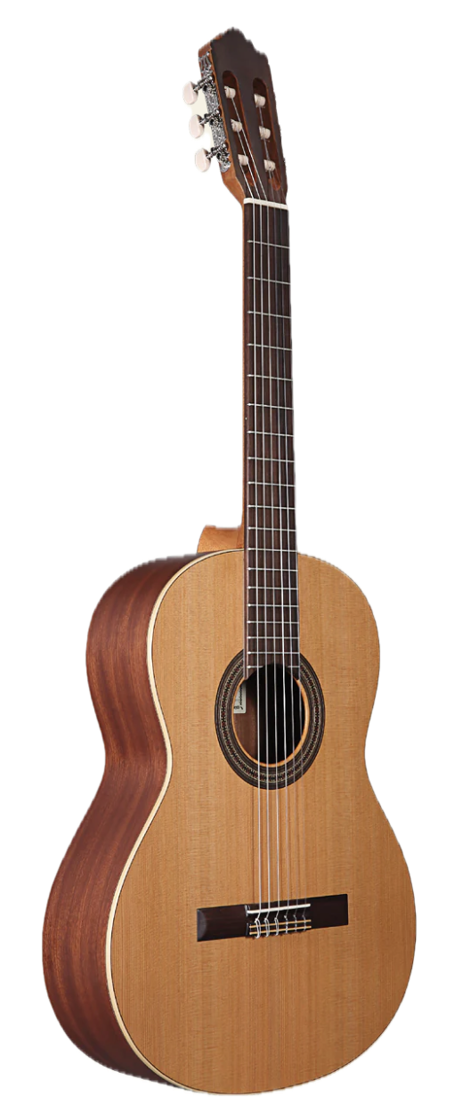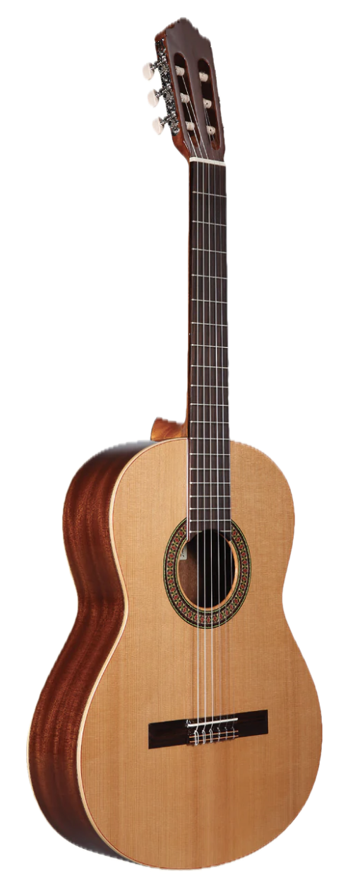 Full size student guitar with gloss finish perfect for grades 2 -5. Solid red cedar top, mahogany body & neck with wood inlays and back strip.
