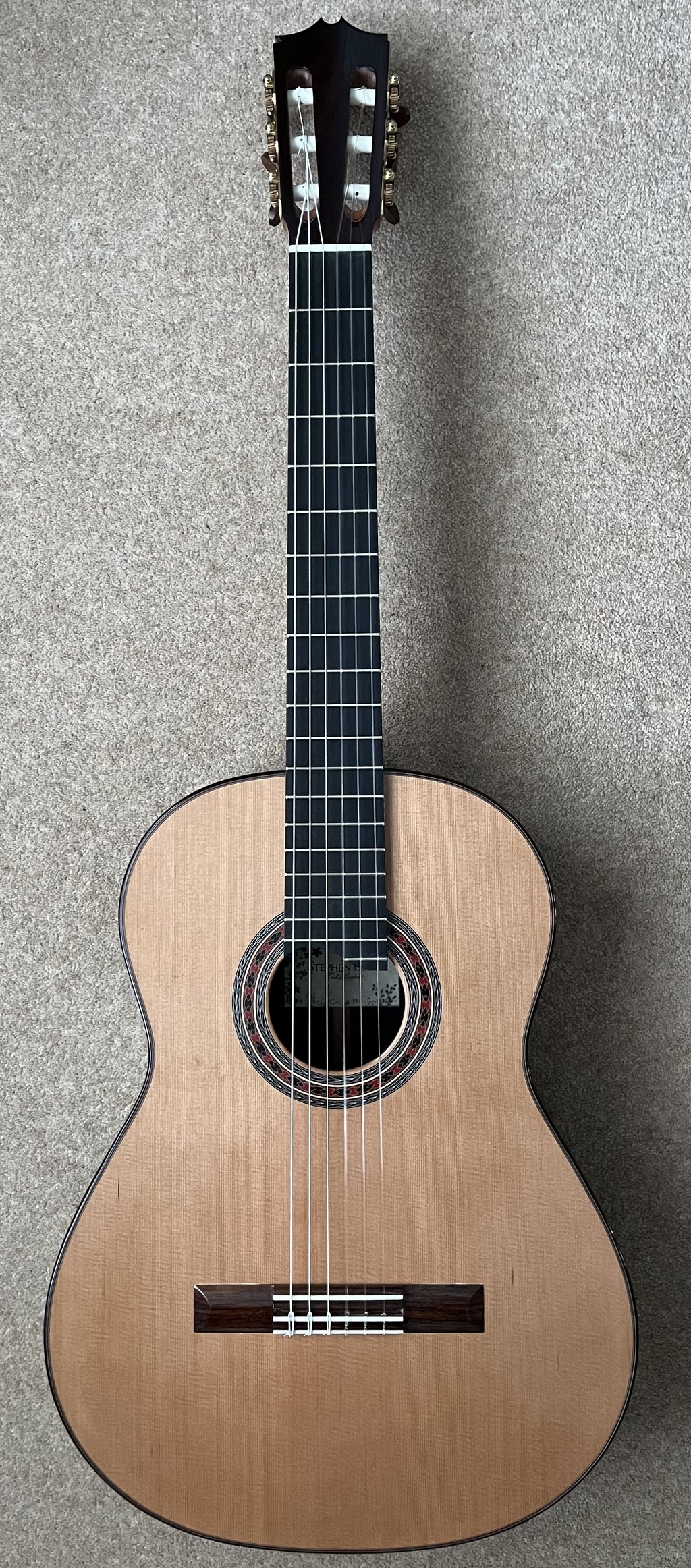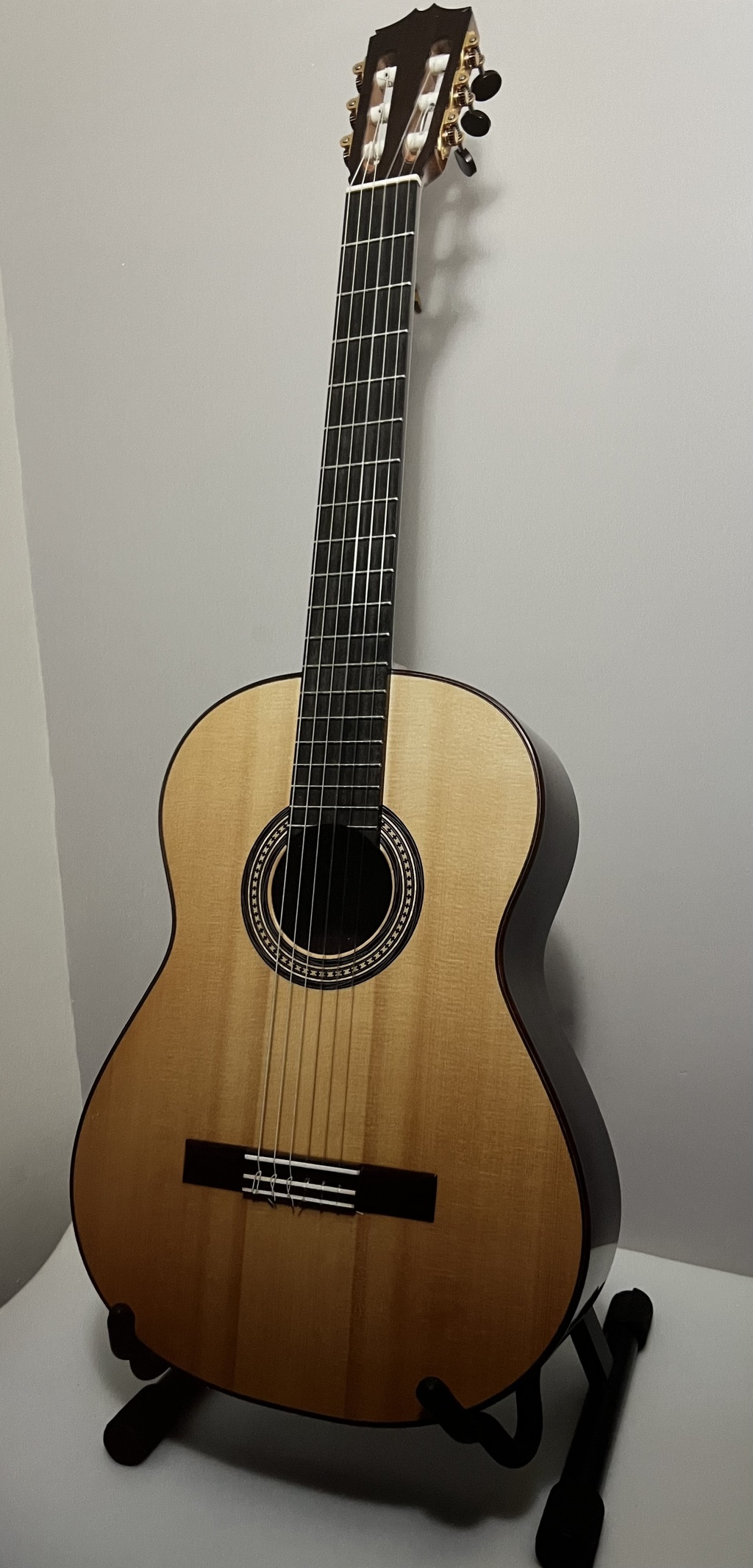 Cedar top with single piece back in wenge, ebony, with inlaid bindings and rose.